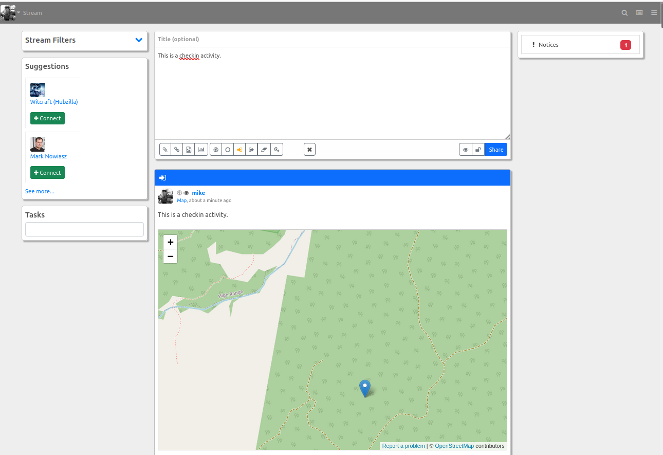 3. The next two buttons display any time geographic location is available in the post. They are "enter" and "leave" icons and are used here to to turn the current post into a "checkin" (Arrive) network activity or a "checkout" (Leave) activity. When either of these options are selected, the icon will change colour to indicate that the post is now a checkin/checkout activity and a map will be inserted into the post. You may add additional text or basically any content. Use the preview ("eye" icon) button to view the results without publishing or click 'Share' to share the post. Clicking one of these buttons a second time undoes the action and turns it back into a normal post.
